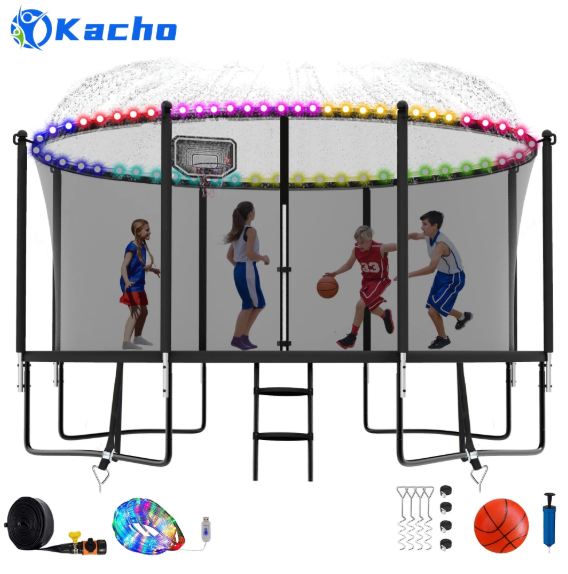 Kacho Trampoline 12FT, Trampoline with Enclosure Net, Sprinkler, Light, Ladder, Outdoor Recreational Trampoline with Basketball Hoop, No Gap Design Trampoline for 3-4 Kids And 1-2 Adults